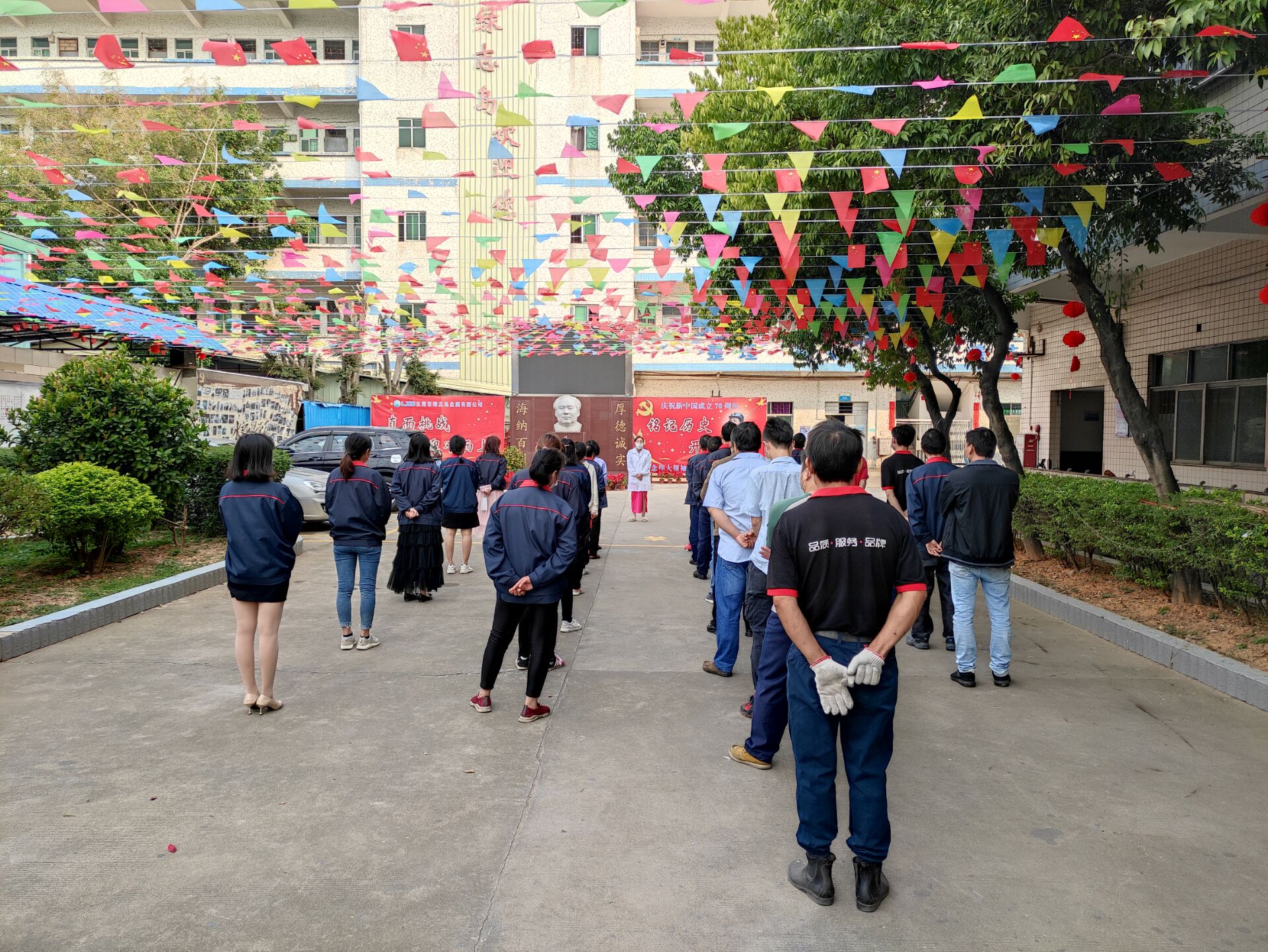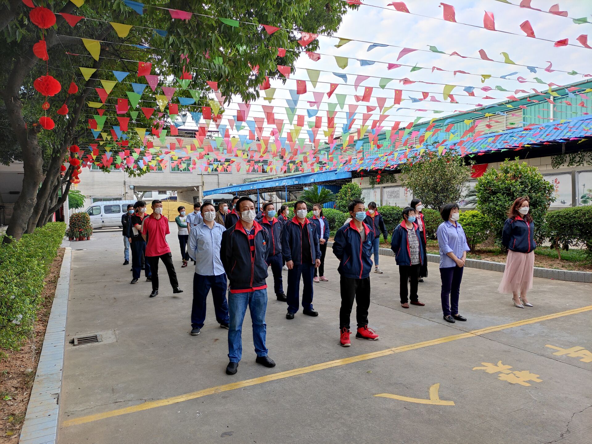 周一早會盧經理在室外給上崗人員宣導防疫知識